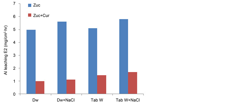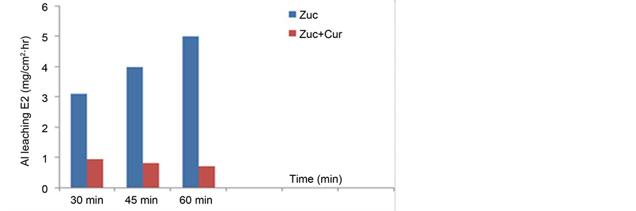 The effect of using Tab water was studied for 30% w/v Zuc only and 60 ppm Cur w/without NaCl. The results are shown in Figure 3. The Al leaching is found to be higher by about 14.3% after adding NaCl to Tab W and DW. The corrosive effect of NaCl is proved by many studies [25] - [30] . The Al leaching in 30% w/v Zuc in Tab water is slightly higher than Al leaching in DW. This is a probable result of the presence of other soluble anions in Tab W which increases the Al leaching [5] [10] . The inhibition effect of Cur is comparable in DW and Tab water w/without NaCl.