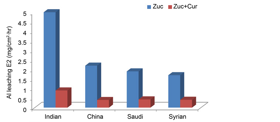 To test the effect of alloying elements, the amount of 60 ppm Cur was added to 30% w/v zucchini (Zuc) in distilled water using the four kinds of Al cookware from China, India, Saudi Arabia and Syria as shown in Figure 5. The Indian alloy showed the highest Al leaching. The percentage of Mg (0.33%) and Zn (0.14%) which are known to increase Al dissolution are higher in the Indian alloy compared to the others [5] [10] . Chromium and copper are known to reduce the corrosion rate [11] . This alloying elements’ effect cannot be attributed to the absence of a single alloying element or the presence of another but rather to the total synergistic effect of all the alloying elements. Although the Indian alloy showed the highest Al leaching, the addition of 60 ppm Cur reduced the Al leaching to an extent which resembles that from other countries. Finally, these Al cook wares may represent one factory only but at least it gives indication about the effect of alloying elements in Al leaching.