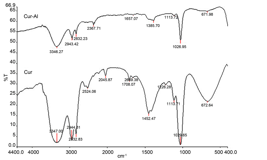 It may be inferred from FTIR spectrum Figure 6 that Cur has coordinated with Al3+ through the phenolic oxygen, ethereal oxygen, and carbonyl oxygen, resulting in the formation of the Al3+-Curcumin complex on the anodic sites of the metal surface. Our findings agree with Johnsirani et al. [19] about adsorption Curcumin extract on carbon steel in sea water [19] . The present findings is also in agreement with Elmsellem et al. [22] using quantum chemical calculations “The density distributions of the frontier molecular orbital (HOMO and LUMO) show that Curcumin adsorbs through the actives centers of oxygen and π electrons of the Curcumin ring” [22] .