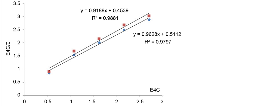 3) Temkin isotherm gave a moderate fit lower than Langmuir adsorption isotherm.
