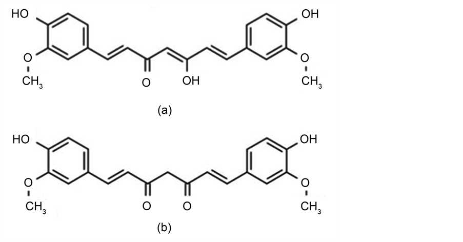 The use of turmeric dates back about 4000 years to the Vedic culture in India [13] . Curcumin (Cur) belongs to the genus Curcuma, which consists of several plant species with underground rhizomes and roots [13] . Turmeric and ginger rhizomes plants belong to the Zingiberaceae family. Curcumin (or Turmeric) was isolated as early as 1815. Curcumin C21H20O6 (MW = 368.38) is the principal Curcuminoid of the popular spices of India. These Curuminoids are natural phenols which are responsible for the yellow color of turmeric. Curor diferuloylmethane, (1,7-bis(4-hydroxy-3-methoxy phenyl)-1,6-heptadiene-3,5-dione) can exist in several tautomeric forms, including a 1,3-diketo form and two equivalent enol forms as shown in Figure 1. The enol form is more energetically stable in the solid phase and in solution (up to 95 percent are in the enol form) [14] . Cur is a major functional component constituting 2% - 5% of turmeric recognized as being responsible for most of its therapeutic effects. Cur has a bright yellow color; its E number is E100. It is reported that Cur had a number of pharmacological activities including antioxidant, anticancer, anti-inflammatory, and analgesic, etc. [14] . Cur is obtained by solvent extraction of turmeric and purification of the extract by crystallization. Cur is an oil soluble pigment; it is insoluble in water at acidic and neutral pH but soluble in alkali. Although Cur is stable at high temperatures, it is unstable in alkaline conditions and in the presence of light [14] . The acceptable use levels of Curcumin from FAO are in the range of 5 - 500 mg/kg depending on the food category [15] .
