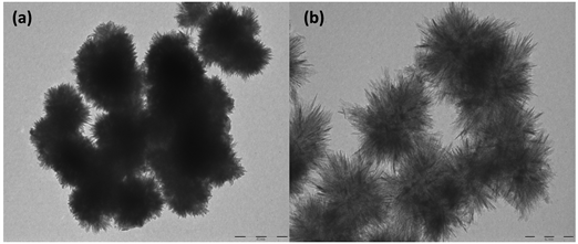 HRTEM micrographs of the synthesized sample are shown in Figure 3. HRTEM images of A1 (synthesized in presence of HNO3) show the formation of flower-like structures. It reveals that these structures are a unique assembly of nanoflowers like structures with ~40 nm length and 10 - 15 nm diameter. It is observed that the reported synthesis process has a capability to produce self organized nanostructures with flower-like morphology without use of any templating agent.