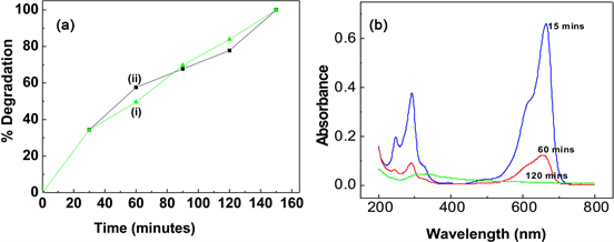 Figure 6. (a) Percentage degradation of methylene blue with time during photocatalysis using (i) A1, (ii) Degussa (Evonik) P-25; (b) Time dependent UV-Vis spectra of methylene blue in presence of catalyst A1.