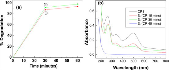 Figure 7. (a) Percentage degradation of congo red with time during photocatalysis using (i) A1, (ii) Degussa (Evonik) P-25; (b) Time-dependent UV-Vis spectra of congo red in presence of catalyst A1.