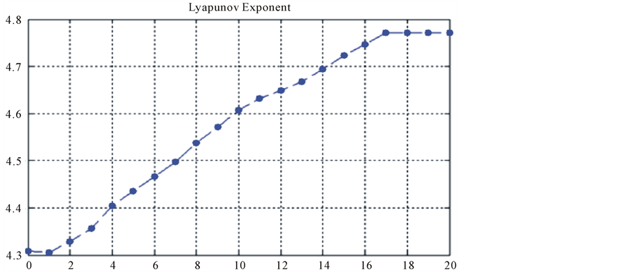 denotes the Lyapunov exponent and n a single iteration of a map. The choice of base 2 in Equations (2) and (3) is arbitrary [8] . The Lyapunov exponents of Equations (2) and (3) are known as local Lyapunov ex- ponents as they measure the divergence at one point on a trajectory (orbit). In order to obtain a global Lyapunov exponent the exponential growth at many points along a trajectory (orbit) must be measured and averaged. The largest Lyapunov exponents of a dynamical system have been developed to be the most important number of invariants, for characterizing chaos. Mathematically, the Lyapunov exponent of a dynamical system is a measure that used to characterize the rate of separation of infinitesimally close trajectories [9] . The Lyapunov exponent is used also to determine the level of chaos within it. In order to determine a global Lyapunov exponent, the expo- nential growth at many points along an orbit must be calculated and then averaged. The largest Lyapunov expo- nent is described as [2] [7] [9] :