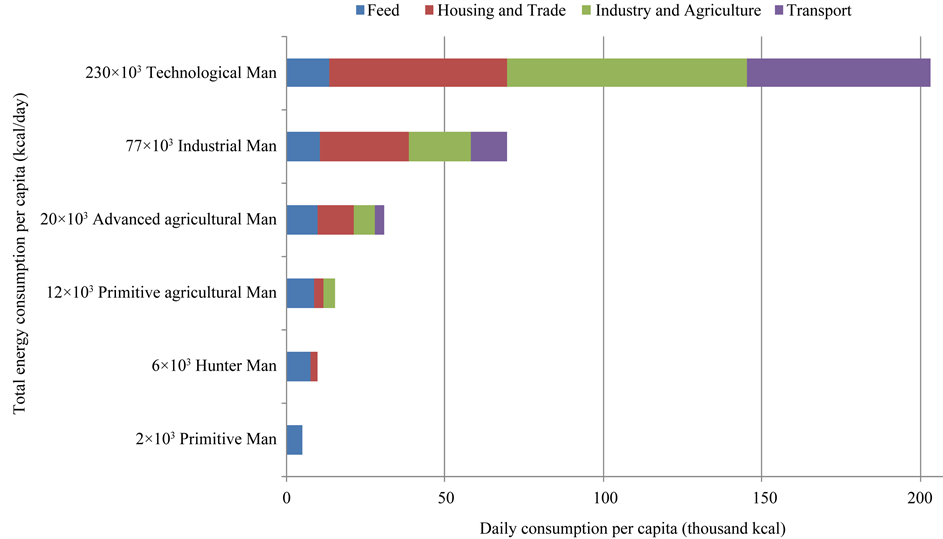 In fact, when looking at Figure 1, below, one sees that the energy needs of society monitor the evolution and development of mankind. From an energy consumption of about 2000 kcal per day, which characterized the primitive man, energy consumption increased by 1 million years to 230,000 kcal per day, taking into account the consumption pattern of the so-called technological man [6] .