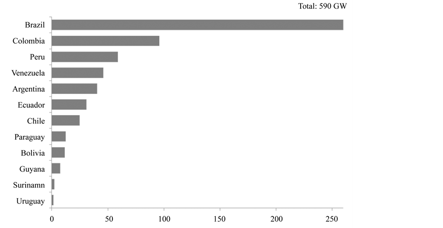 The Andes is a large mountain range spanning five countries in South America―as well as being a natural border between them―and constitutes a major mineral area in the world: gold, silver, copper, zinc, nickel, iron granite among others. The Amazon River, its waters represent much of the available freshwater in the world. This river originates in Peru, crossing the border with Colombia until you reach the tri-border involving these two countries and Brazil. Not coincidentally, these three countries are those with the potential hydroelectric May in South America, as shown in Figure 2.