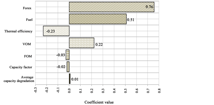 The three input parameters (thermal efficiency, fixed O & M cost, and plant capacity factor) (Figure 3), have negative correlation coefficients. Typically, this indicates that these parameters are each inversely proportional to the CoE when other input parameters are held constant. This reveals significant information.
