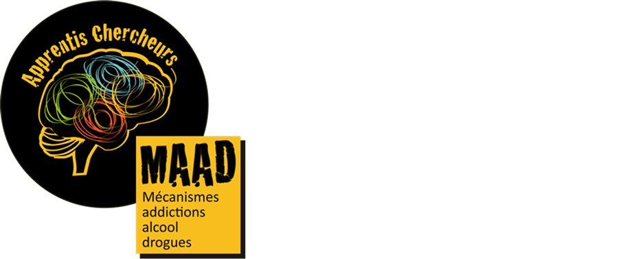 In 2012, we decided to adapt the program “Apprentis Chercheurs” to sensitize young people to the deleterious effects of addictive drugs. According to National Research Council (National Research Council, 1996) , the scientific literature contains the knowledge and the understanding of scientific concepts that are necessary for making informed decisions on personal and societal issues. In this context, our hypothesis is that performing experimentation showing the toxic potential and /or the addictive power of drugs using experimental models, either animal or not, would lead to modify their representations of the product and strengthen their awareness that the drug-related pleasure is associated with its harmfulness. Moreover, the duration of this program, all along the school year, would allow establishing a reliable link between the young and his (her) supervisor. Consequently, as the latter is a professional of the scientific research (researcher, engineer, PhD student, post-PhD student), their relationship is not be based on morality since the “Apprentis Chercheurs” share actual researches with the scientist and is not only listening the voice of the adult. The program is named MAAD, Mechanisms of Addiction to Alcohol and Drugs; in order to outspread the concept in the concerned schools and beyond we created a logo which is presented in Figure 1.