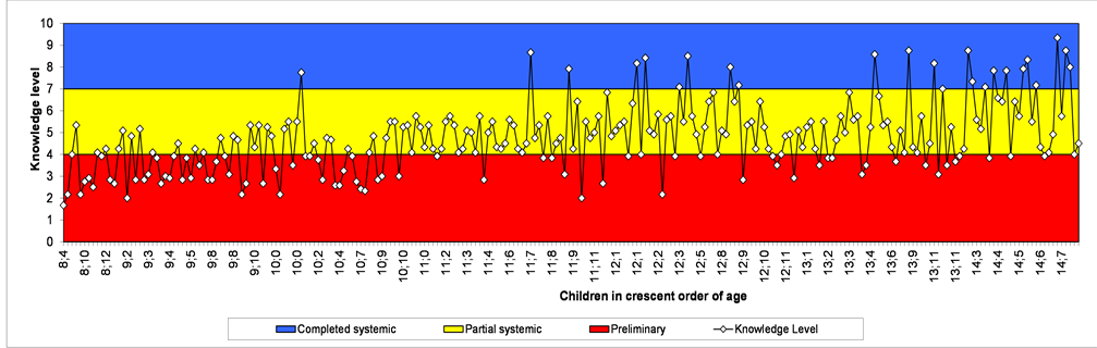 In short, we found that in the thirteen to fourteen age group only 21.4% of the adolescents showed Systemic Knowledge and the majority showed Partial Systemic Knowledge (56.5%).