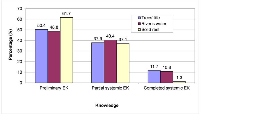 Students with preliminary environmental knowledge have no specific knowledge about trees, their importance, social and ecological function. Trees appear to be an element in isolation from the rest of nature’s elements. The students think that rivers are polluted because they notice solid wastes on their banks and the foul smell, but they are unaware of the real causes of pollution and its effects on the health of human beings and other living beings (Figure 2).