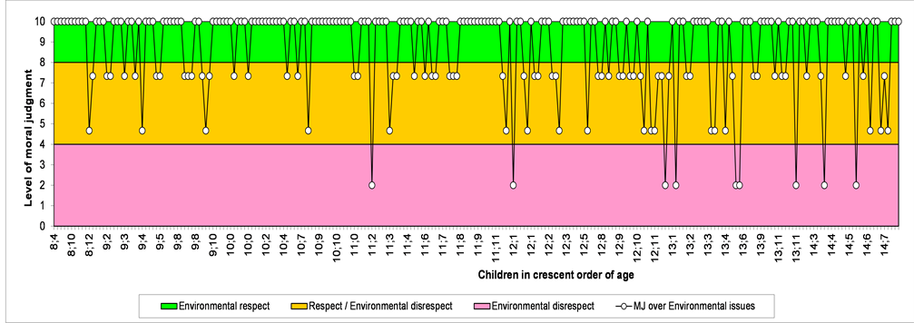 Moral Judgements in Disrespect of the Environment increased in the thirteen to fourteen age group, to the detriment of MJ in Respect, which has to be associated with moral development itself (Table 3).