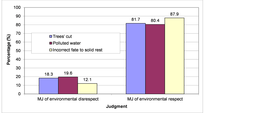 In general, Moral Judgement (MJ) in Respect of the Environment was predominant in 83.3% of the environmental dilemmas, whilst MJ in Disrespect of the Environment was 16.7%. When assessing MJ incidence in relation to the different themes, it was found to be homogeneous, with slightly more MJ in Respect of the Environment for the dilemma of inadequate disposal of solid waste and slightly more MJ in Disrespect of the Environment for polluted waters (Figure 4).