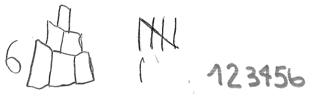 At the third school, unfortunately only 38 children (out of 53) were present on the day of the follow-up interview. Nine of these counted the number of cubes in the new tower correctly, and 12 gave answers involving the idea of “cubes behind”. The majority of these children used their fingers when counting both visible and hidden cubes. Some children, however, counted stacks instead, for example: