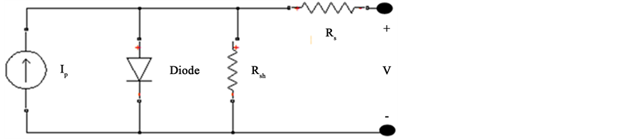 PV generates power by converting sunlight to electricity. The electric current generated is proportional to solar irradiation. PV cell can generate around 0.5 to 0.8 volts. Because of the small power generated by PV cell, modules contain several PV cells are connected in parallel or series to form PV panel. Furthermore, panels are connected in parallel and/or series to form an array [15] . The equivalent circuit of a PV cell includes diode, shunt resistance, series resistance representing an internal resistance to current flow, and current source is illustrated in Figure 1.
