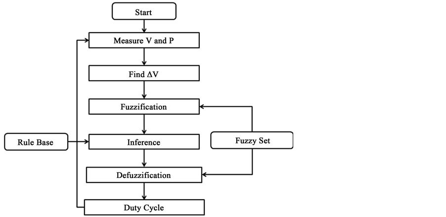 The flow chart of the MMPT is shown in Figure 5. The PV system composed of PV panel, Boost converter, MPPT and resistive load as shown in Figure 6. The proposed algorithm consists of fuzzy logic controller with pulse width modulator connected to the boost converter.