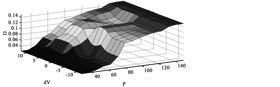 Figure 8. Surface view for fuzzy inputs (P, dV) vs. output (D).