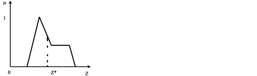 In this work, five subsets for each input and twenty five rules have been used. Based on the results of Simulink model, tuning the rules is performed to design the fuzzy logic controller. The proposed fuzzy rules of the system are shown in Table 1. Values of fuzzy controller inputs are compared with twenty-five rules of the system and are implicated with the membership functions. The implication has been chosen to be “and” operator. The rules were implicating by taking the minimum value of the membership function of the inputs for all the truth rules. The implicated rules were aggregated using maximum method. Figure 8 shows the surface view for the relation between fuzzy inputs and output. The simulated model needs a crisp value from the fuzzy controller, thus a defuzzification of the output membership function after aggregation is a must. Centroid method has been selected for defuzzification by calculating centre of mass of the aggregated membership function. The centroid method is one of the most physically appealing and prevalent method of all defuzzification methods.The crisp value represents the duty cycle of the switching signal that triggers the IGBT in the boost converter. This pro- cess is usually called Center of Gravity or Center of Area. The final membership function after aggregation is shown in Figure 9, while Z* is the value of the centroid and can be calculated as [20] .