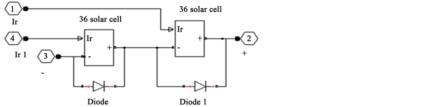 Partially shaded model is developed by connecting in series two modules as shown in Figure 12. Bypass diode is connected to each module provides protection against reverse current. Each module is allowed to receive different level of irradiation.
