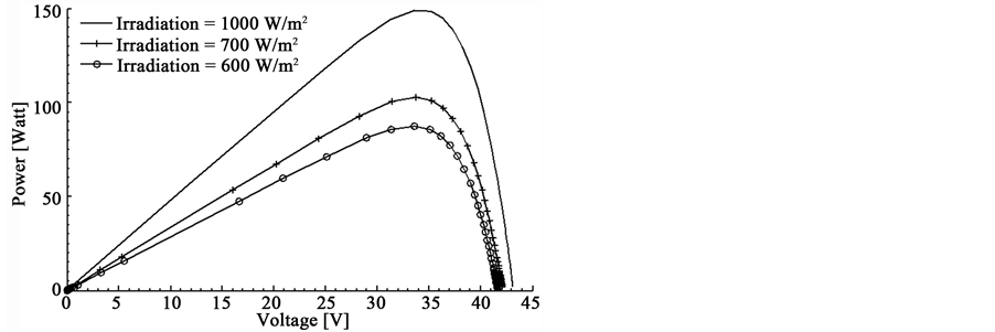 To evaluate the performance of the proposed algorithm, three different conditions are simulated: 1) Uniform irradiation; 2) Sudden changing; 3) Partial shading. Figure 14 shows the MPP for different irradiation levels. The maximum power output reached 148 Watt when PV module is subjected to 1000 Watt/m2. Furthermore, when the irradiation is decreased to 700 Watt/m2 and 600 Watt/m2, the resulted maximum power is 102 Watt and 87.2 Watt respectively. As shown in Figure 15, two peaks are appeared in P-V curve when the PV is subjected to partial shading corresponding to 70 and 96.9 Watt.