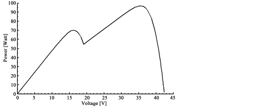 Partial shading is defined as a shadow falling on part of the PV system, which will in turn decrease the current generated for shaded cells, and resulted in decreasing the overall power generated from the PV system. The case study in this paper will examine the overall power generated from the PV system when applying the partial shading on 36 cells which represents 50% of the system. Figure 3 shows the effect of shading on 36 cells of the system on P-V curve. The shading was applied by decreasing the irradiation on 36 cells of the PV system from 1000 to 700 Watt/m2. As shown in the figure, multiple peaks are presented in the PV characteristic under partial shading condition. Thus, tracking algorithms become more complicated under partial shading condition.