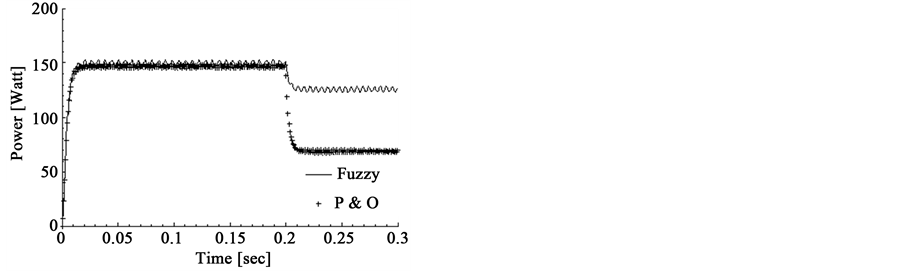 Levels of irradiation were suddenly increased or decreased on the whole panel to test the ability of FLC under sudden changes in irradiation. In this case, the PV characteristic curve has one peak. Several tests were achieved by changing irradiation on the panel suddenly at 0.2 sec. As it can be seen in Figure 17, FLC has excellent ability to track MPP in less than 0.01 second when PV is subjected to sudden changes in irradiation. Figure 18 show the output power for fuzzy controller compared with P & O algorithm for partial shading condition. When PV is subjected uniform shading, both controllers works properly and reached maximum power point. When PV panel is subjected to partial shading at 0.2 sec, both controllers detects irradiation changes. P & O algorithm changes the value of duty cycle of the switching signal of the converter to track the MPP by a fixed step each time. Because of this fixed step, optimal values are not necessary reached.