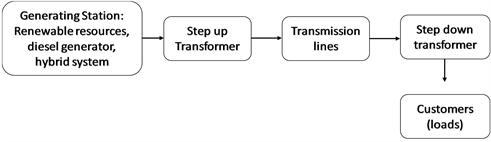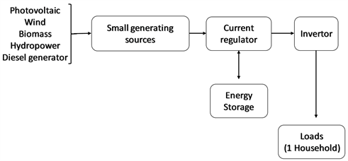 The figures presented below show the existing rural electrification models. Figure 1 represents the decentralized model using both renewable and non-renewable energy. Microgrid systems which are designed to supply electricity for loads such as small village [82] are presented by Figure 2. Furthermore, the grid extension suitable for a high consumption is presented by Figure 3.
