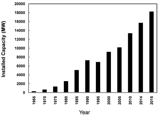 Energy consumption in Kuwait is increasing very rapidly at a rate of about 7% annually. This is completely due to the building of new residential places, fast economic and development growth as well as the harsh climatic conditions. The peak load achieved 12,410 MW in summer 2014. So, the Kuwaiti government continuously set up brand new power production plants to fulfill the demand increase in energy consumption. Power plants size has expanded sharply from 70 MW in 1960 to 18,259 MW in 2015. Consequently, energy produced has developed from 1000 Million kWh in 1960 to 68,288 Million kWh in 2015 [42] . Additionally, the peak demand has considerably increased from 2100 MW in 1980 to 12,810 MW in 2015. Nearly about 50% of energy produced in Kuwait is consumed in domestic applications as the government and people construct additional urban areas. Also, air conditioning (AC) load represents significant part of the energy consumption in Kuwait. Figure 2 presents development of power stations capacity in Kuwait for the period 1960-2015.