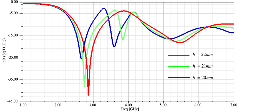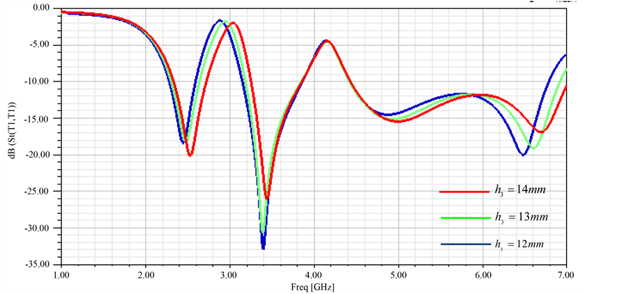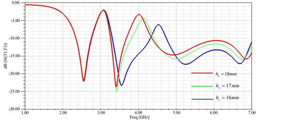 Keep the outer fan height and other variables constant and respectively change the second and the third height of the nested fan, the results of which are shown in Figure 4 and Figure 5, and the relevant data statisticsis shown in Table 1. The electromagnetic analysis of the antenna is done by means of finite-difference time-do- main (FDTD) using the commercially available HFSS.