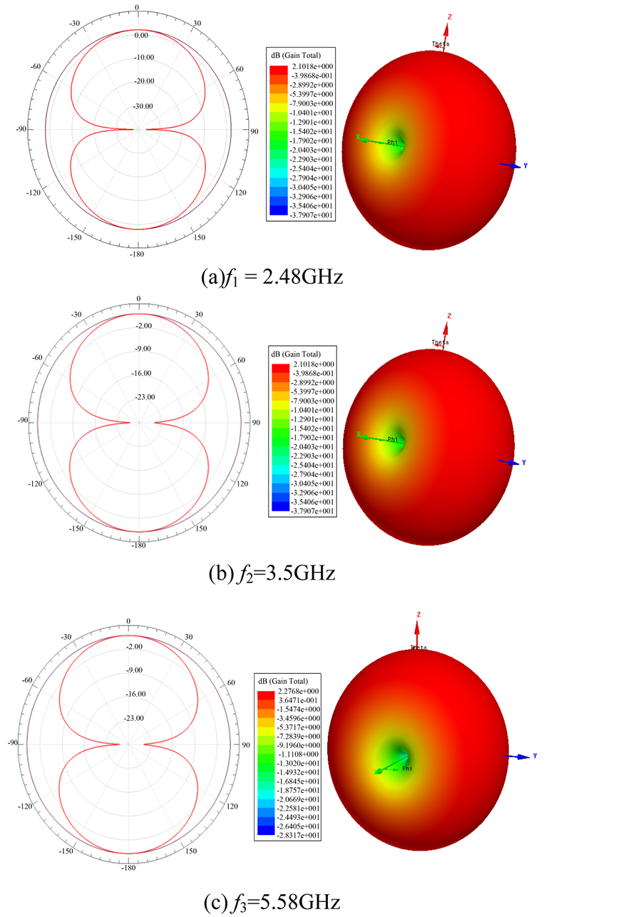 Figure 7 shows the antenna simulated results. It can be seen from the simulated results that the antenna has operating bands of 2.38 - 2.785 GHz, 3.21 - 3.82 GHz and 4.42 - 6.825 GHz respectively, and the bandwidths can meet the requirement of WLAN/WiMAX communication. Figure 8 gives the simulated radiation patterns at 2.48, 3.5, and 5.58 GHz. The structure of the proposed antenna is symmetrical in E plane, therefore the pattern is also symmetric in E plane and is a figure of eight in E Plane. It can be seen that this antenna has the nearly omni-directional radiation characteristics, while the cross-polarization level rises with frequency increases owing to the horizontal components of the surface currents. In addition, consistency of the pattern exists for all frequencies in the operating band.