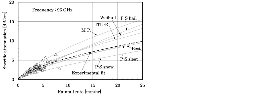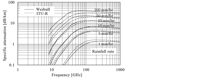 ITU-R P.838-3 [6] provides a prediction model for rain attenuation. In that model, the attenuation coefficient γR [dB/km] from rainfall intensity R is calculated from