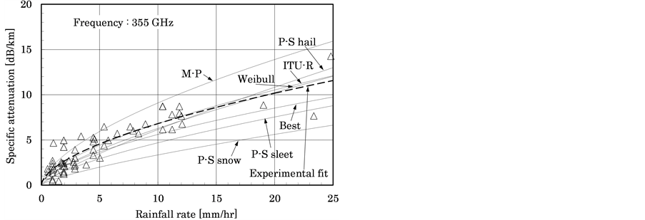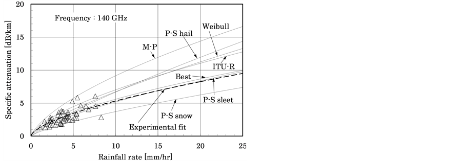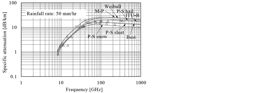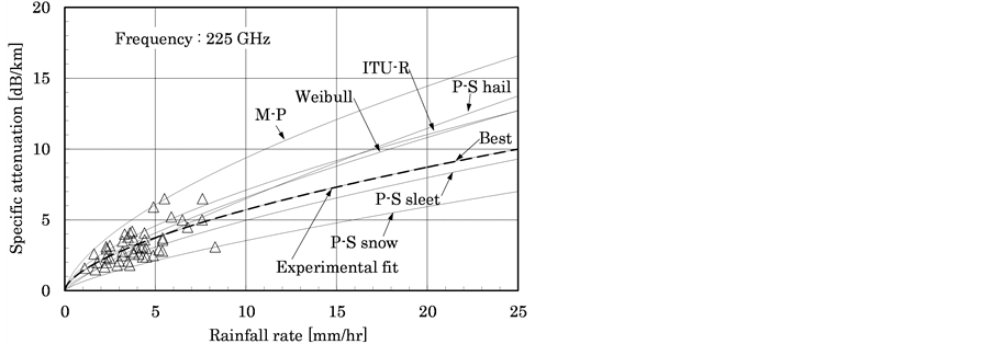 Conventional methods of predicting rain attenuation in wavebands above the microwave band have been based on Mie scattering theory with various distributions of raindrop particle size [3] - [5] or with the International Telecommunications Union Radiocommunication Sector (ITU-R) recommendations, which provide a prediction model for rain attenuation between at wavelengths between 1 and 1000 GHz [6] . However, to the authors’ knowledge, no reports have been published on evaluating rain attenuation from the microwave through terahertz bands and comparing calculated values with actual measurements.