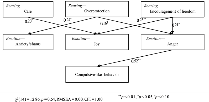 Compulsive-like behavior is a phenomenon that appears during the course of normative development in children. However, some empirical studies have suggested that compulsive-like behavior has common emotional and neuropsychological bases with pathological OCD. Investigation of the mechanisms behind the genesis of compulsive-like behavior in children may contribute to increased understanding of OCD. Thus, the aim of this study was to investigate the effects of maternal rearing attitudes and depression on compulsive-like behavior in children and how these effects were mediated by children’s emotional traits. The questionnaire was completed by mothers of children aged 3 - 6 years (N = 116). The questionnaire consisted of four measures: 1) children’s compulsive-like behavior; 2) children’s emotional traits (subscales: anxiety/shame, joy, anger); 3) maternal rearing attitudes (care, overprotection, encouragement of freedom); and 4) maternal depressive tendencies. Correlation analysis did not reveal any significant correlations between maternal factors and compulsive-like behavior in children. In contrast, path analysis using structural equation modeling to test the hypothesis that children’s emotional traits play roles in mediating variables indicated that maternal rearing attitudes, overprotection, and encouragement of freedom influenced compulsive-like behavior in children through the children’s anger trait. Maternal depression had no significant effects on children’s emotional traits and compulsive-like behavior. These findings suggest that maternal behaviors do not directly influence compulsive behaviors in children but that they affect children’s behavior through the process that shapes more fundamental individual differences in emotion among children. Furthermore, the result that not the children’s anxiety but their anger trait was found to have an effect on compulsive-like behavior is also notable. This result supports recent reconsideration of the hitherto-held concept that anxiety lies at the core of OCD. A detailed investigation of the relationship between anger and OCD (and its peripheral phenomena) is urgently needed. The effects of maternal rearing attitudes on children’s emotional traits were also revealed by this study. Overall, our study provides evidence regarding the mechanisms behind the genesis of compulsive-like behavior in children. Children’s compulsive-like behaviors are affected by maternal rearing attitudes not directly but through the mediating influence of children’s anger trait.