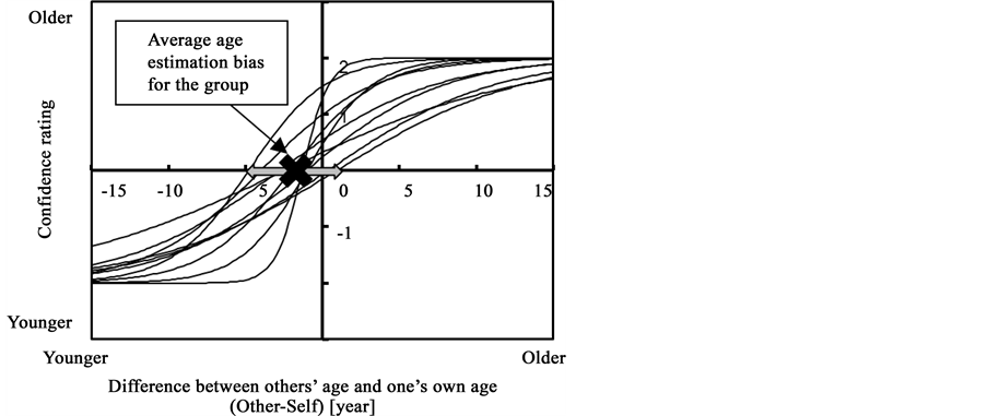 When these data were plotted onto the graph shown in Figure 3(a), we assumed that this distribution was approximated by a logistic function, and applied a nonlinear regression analysis to the distribution for each participant. The actual age difference between the facial images and the participants (x-axis) was defined as the independent variable, and participants’ confidence ratings of relative age estimation for others (y-axis) were defined as the dependent variable. The logistic function, which converged at a rating value of ±2, was defined by the following formula: