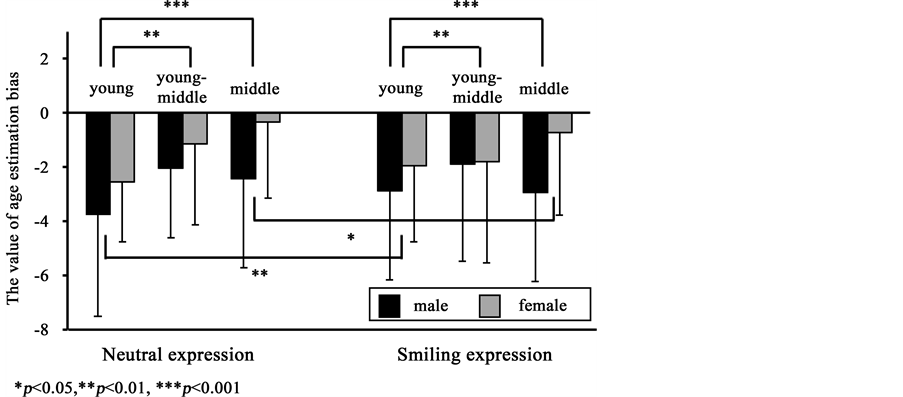 The results of the present study found that participants’ ages, gender, and facial expression stimuli were related to age estimation bias, in the following ways: a) Differences in age: age estimation bias was larger in the young age group, regardless of facial expression; b) Gender differences: age estimation bias was larger among male than female participants; the female participants’ age biases were closer to their real ages; c) Difference in expression: in the young age group, age estimation bias was smaller for the smiling facial expression stimuli than for the neutral expression stimuli; it was also found to be closer to the participants’ real age. However, in the middle age group, age estimation bias was larger in the case of the smiling stimuli compared to the neutral expression stimuli.