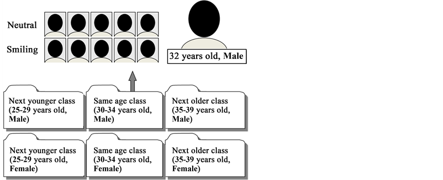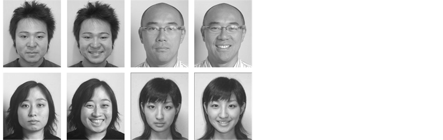 We constructed facial image dataset to be used as the experimental stimuli. We used a total of 480 full-color 300 × 350-pixel facial images of Japanese individuals ranging from 20 to 59 years old. The pictures were taken at the laboratory on a white-tinged background under controlled illumination conditions. No restrictions were imposed on the participants concerning clothing and accessories, make-up, hairstyles, etc. (Figure 1). The facial images were prepared digitally and were grouped into 22 classes by gender (male or female) and age (at five-year intervals). In regards to the groupings, the participants needed to be exposed to the facial images from as similar an age group to themselves as possible to perform the age judgment task within limited presentation numbers, because relative age judgment is expected to be more difficult when the image one is viewing if closer to one’s own age. Therefore, we grouped the participants into various classes by age (at 5-year intervals) because we needed to expose the participants to facial images from a similar age group in an effective and uniform manner. Data on actual age and gender were recorded for all images. Each image showed the same face with two different expressions (neutral and smiling). The reason we used only the smiling face in many of the presented pictures is that smiling has been shown to exert a greater influence on age estimation bias, compared with other expressions ( Voelkle, Ebner, Lindenberger, & Riediger, 2012 ).