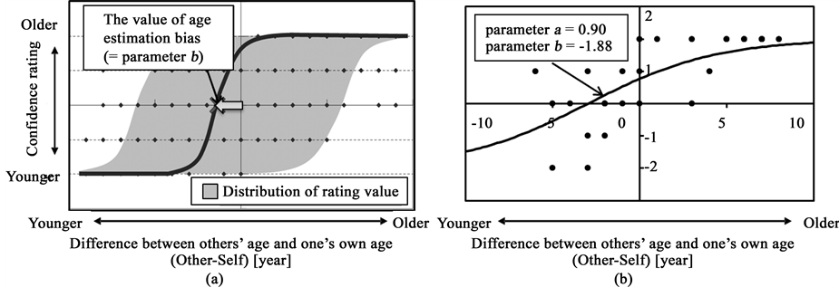 Figure 3. (a) Calculating the bias of age estimation. Each data point represents one image judgment. The x-axis represents the difference between the actual age of the individuals whose faces were shown and the age of the participant. A positive value for x indicates that the stimulus face is older than the participant, while a negative value indicates an image that showed a face that was younger than the participant’s actual age. The y-axis represents the participant’s confidence rating of their relative age estimation for the image. If this value is negative, it means that the participants perceive younger faces to actually be the same age as themselves; (b) Actual estimated curve and the parameters (a and b) obtained by applying the non-linear regression analysis to one participant’s response.