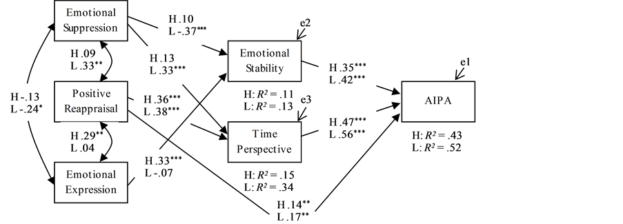 Based on the results of correlation analysis above, an early causal model was developed and examined through covariance structure analysis. First, considering the result that a correlation of either high or low SS group was significant, covariance was assumed among the three variables of ERB, which were exogenous variables. Next, goodness-of-fit indices of the model were calculated regarding the high and low SS groups respectively. The early causal model was developed using paths with significant correlation coefficients in both groups or in either of them. As a result, goodness-of-fit indices in the high SS group were χ2 (5) = 6.59 (p = .25), SRMR = .05, RMSEA = .06, CFI = .98, and that in the low SS group were χ2(5) = 4.90 (p = .43), SRMR = .04, RMSEA = .00, CFI = 1.00, and both of them were considered to be sufficient. Subsequently, aiming to confirm configural invariance between high and low SS groups, goodness of fit of the model without imposing equality constraints on every path between high-low SS groups (the configural invariance model) was examined through multi-group analysis. Obtained goodness-of-fit indices were χ2(10) = 11.48 (p = .32), SRMR = .05, RMSEA = .03, CFI = .99, and they were sufficient. The results above indicated the structure of the analysis model was assumed to be equal between high and low SS groups. Next, differences in the estimate values of path coefficients between high and low SS groups were examined. The results indicated z value of the path coefficient from emotional suppression to emotional stability (z = −3.44, p < .001) and that from emotional expression to emotional stability (z = −2.59, p < .001) were significant, and differences among two groups were confirmed. On the other hand, significant z values were not indicated in the path coefficient from positive reappraisal to time perspective (z = 1.24, ns) as well as to AIPA (z = −.55, ns), from emotional suppression to time perspective (z = 1.47, ns), from emotional stability to AIPA (z = 1.16, ns), from time Perspective to AIPA (z = .67, ns), from emotional suppression to emotional expression (z = −.80, ns) as well as to positive reappraisal (z = 1.89, ns), and from positive reappraisal to emotional expression (z = −1.46, ns). Differences between high-low SS groups were not indicated regarding these paths.