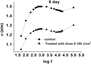 Figure 3. The obtained data of the dielectric parameters and RBCs count before and after irradiation, (a) conductivity of control and irradiated (0.0287, 0.0563 and 0.198 J/cm3 doses) samples after 50 days; (b) RBCs counts of control and irradiated samples for different doses; (c) conductivity versus frequency of control samples during storage days (9, 24, 30, 35 & 50).