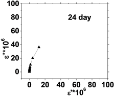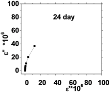 The center of the semicircles is not located at the x-axis, but deviated below that axis where the radius of the circle making an angle (απ/2) with the έ axis. Tan απ/2 is determined and hence the phase angle (α) is calculated. The experimental data of the variation in dielectric loss ε" of HB with permittivity έ for control sample (without irradiation) and irradiated samples during preservation days and other dielectric parameters calculated from the last figures are summarized in Table 1.