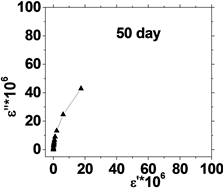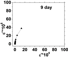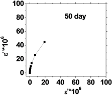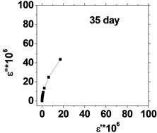 Figure 5. (a) The relation between the dielectric constant (έ) and dielectric loss (ε'') for control with preserved days; (b) the relation between dielectric constant (έ) and dielectric loss (ε'') after irradiation with 0.198 J/cm3 of He-Ne laser at preserved days (9, 24, 30, 35 & 50).