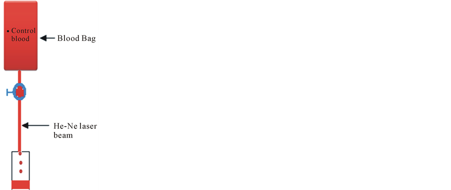 Blood bag: A Blood bag of 450 ml ± 10% (Agarry) which contains CPDA-1 was used. Most blood collection bags (adult) contain 63 ml CPDA anticoagulant Fresh human blood was obtained from ten healthydonor. Thirty small bag samples were papered to determine the normal dynamics of some dielectric, blood count parameters during the preservation period. They are divided into six groups stored, one control and five group’s irradiated with He-Ne laser. The blood samples were storage before and after irradiation in transfused bags at 6˚C - 8˚C for (9, 24, 30, 35 & 50) days. c) Irradiation method Irradiation was carried out using a source of He-Ne laser (U.S.PAT. 311, 969), continues wave, 632.8 nm, 2 mm spot diameter, 30 mW, for three doses 0.0287, 0.0563 and 0.198 J/cm3 to relevant the best exposure dose during storage periods 9, 24, 30, 35 & 50 days. The laser beam was in contact to the narrow rubber tube through which blood flow, as shown in Figure 1 [1] .