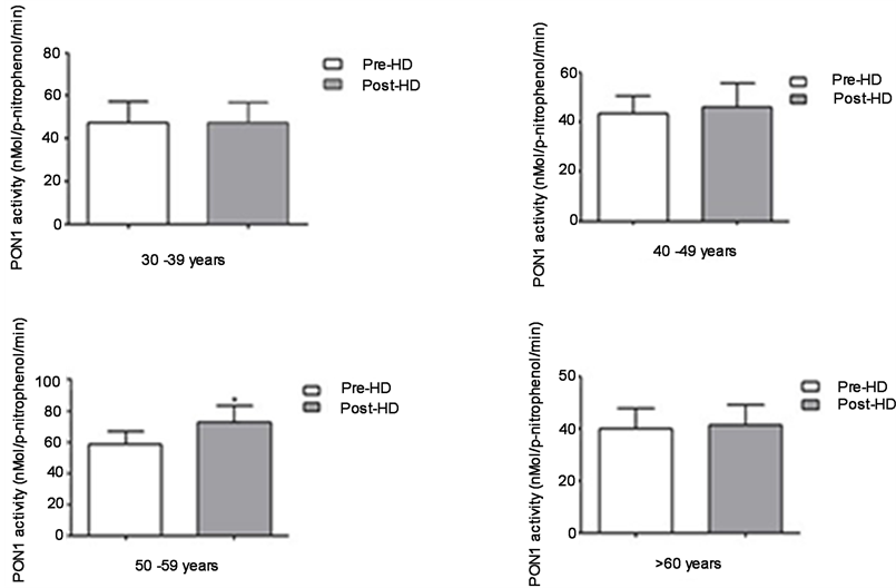 Figure 1. Paraoxonase activity determined by spectrophotometric method from samples of 50 patients undergoing hemodialysis; comparison between pre and post hemodialysis activities; paired t test, Wilcoxon test post; significance at p < 0.05, 95% CI. Pre- vs Post-HD (p < 0.05*), aged 50 - 59 years.
