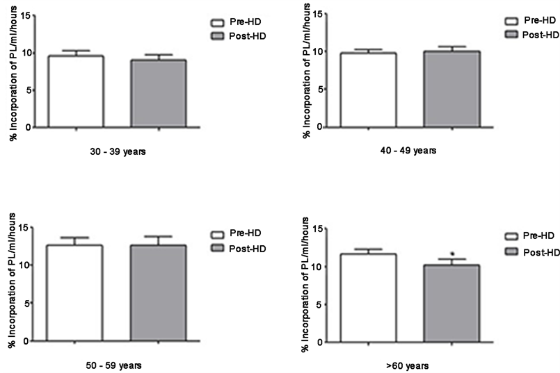 Figure 2. Incorporation of PL in HDL from different age groups by exogenous substrate, an in house method. Paired t-test, post Wilcoxon test; Significance for p < 0.05, 95% CI. Pre- vs Post-HD (p < 0.05*), aged >60 years.