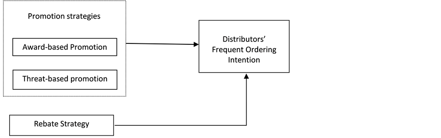 point dependence”, in reward promotion strategy, if the ordering price of specified product would be lower than reference price and Distributors feel more utility and profitable transaction, there are more chances for them to determine to order. However, in line with prospect theory, at least ten researches show that Distributors’ responses under “profit” and “loss” are dissymmetry. In general, people give stronger responses to price rising than to price reduction (Kalyanaram and Winer, 1995) [11] . Because of effect of reference point, Distributors have different experiences of “profit gaining” and “profit loss”. For profit gaining, people would incline to choose determinate results; for profit loss, they would incline to risk more. Therefore, for reward promotion, Distributors’ prospect of future is “profit gaining”; and “profit loss” for threat promotion. In this case, once Distributors decide to order, they must have stronger reaction to threat promotion. It is quite possible that Distributors more frequently order. Based on the above reasoning, we think that Distributors have stronger intention of determining to order under reward promotion than under threat promotion. Among Distributors choose to order, they have stronger intention of frequent ordering under threat promotion than under reward promotion.