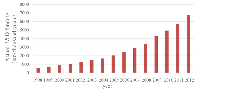 Figure 1. 1998-2012 Actual R&D funding histogram in China.
