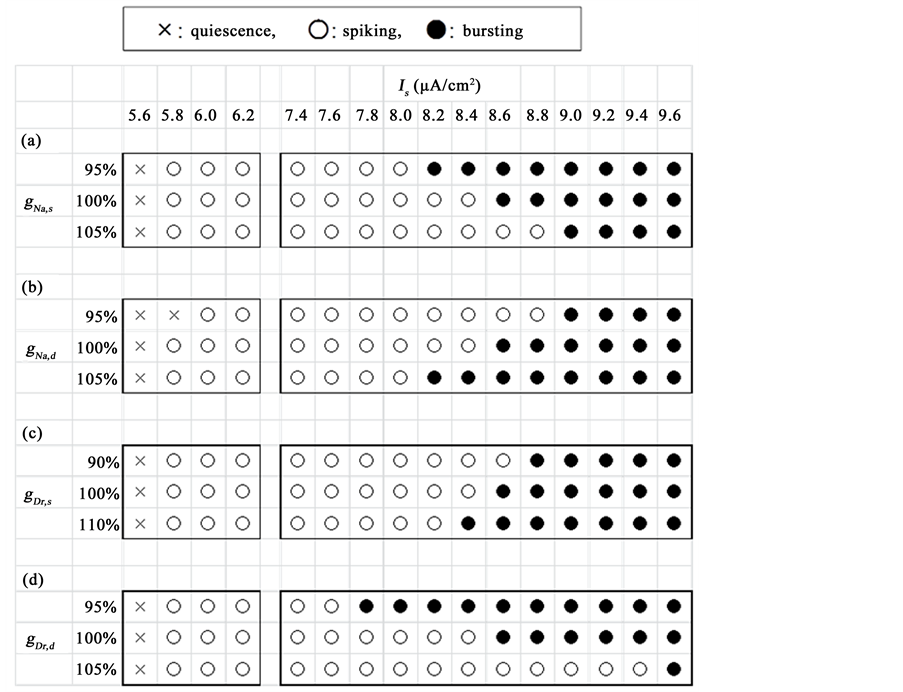 was 5.6, a repetitive spiking state (○ in Figure 1) when Is was between 5.8 and 8.4, and a bursting firing state (● in Figure 1) when Is was between 8.6 and 9.6. The repetitive spiking threshold (Is = 5.8) did not change even if gNa,s decreased to 95% or increased to 105% of the default value [Figure 1(a)]. The bursting threshold (Is = 8.6) was sensitive to variations in gNa,s: it decreased to 8.2 when gNa,s decreased to 95% of the default value, whereas it increased to 9.0 when gNa,s increased to 105% of the default value [Figure 1(a)]. The repetitive spiking threshold (Is = 5.8) increased to 6.0 when gNa,d decreased to 95% but did not change when gNa,d increased to 105% [Figure 1(b)]. The bursting threshold (Is = 8.6) was sensitive to variations in gNa,d; it increased to 9.0 when gNa,d decreased to 95%, whereas it decreased to 8.2 when gNa,d increased to 105% [Figure 1(b)]. The repetitive spiking threshold (Is = 5.8) did not change even if gDr,s decreased to 90% or increased to 110% [Figure 1(c)]. The bursting threshold (Is = 8.6) was sensitive to variations in gDr,s; it increased to 8.8 when gDr,s decreased to 90%, whereas it decreased to 8.4 when gDr,s increased to 110% [Figure 1(c)]. The repetitive spiking threshold (Is = 5.8) did not change even if gDr,d decreased to 95% or increased to 105% [Figure 1(d)]. The bursting threshold (Is = 8.6) was sensitive to variations in gDr,d; it decreased to 7.8 when gDr,d decreased to 95%, whereas it increased to 9.6 when gDr,d increased to 105% [Figure 1(d)].