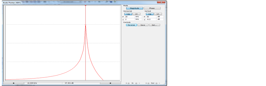In the above simulation result, we show the frequency response of band pass filter made from voltage controlled floating inductance, a resistance and a capacitor. The band pass filter was designed for frequency f0 = 5 kHz, 7.1 kHz and 10 kHz with different value of inductance as given in Table 1. The center frequency of filter was found to be electronically tunable from 5 kHz to 10 kHz with Vc varying from 1 to 4.