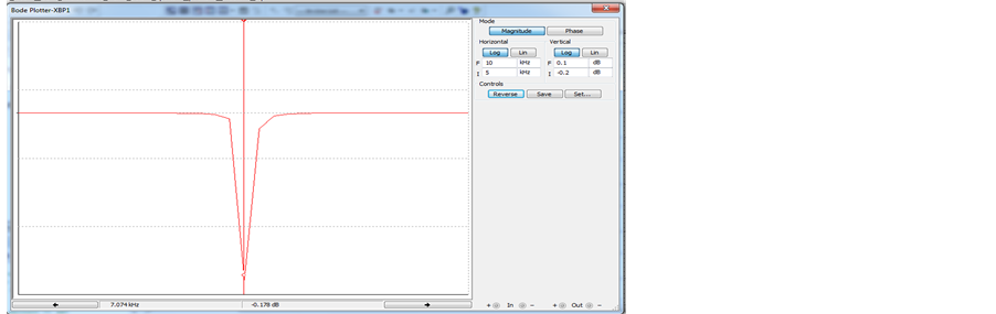 In the above simulation result, we show the frequency response of notch filter made from voltage controlled floating inductance, a resistance and a capacitor. The notch filter was designed for frequency f0 = 5 kHz, 7.1 kHz and 10 kHz with different value of inductance as given in Table 2. The center frequency of filter was found to be electronically tunable from 5 kHz to 10 kHz with Vc varying from 1 to 4.