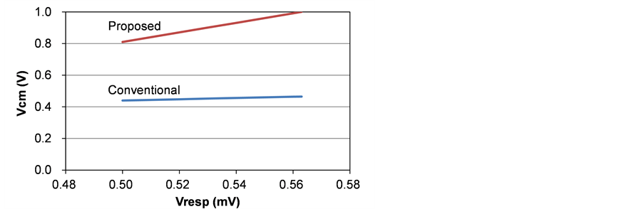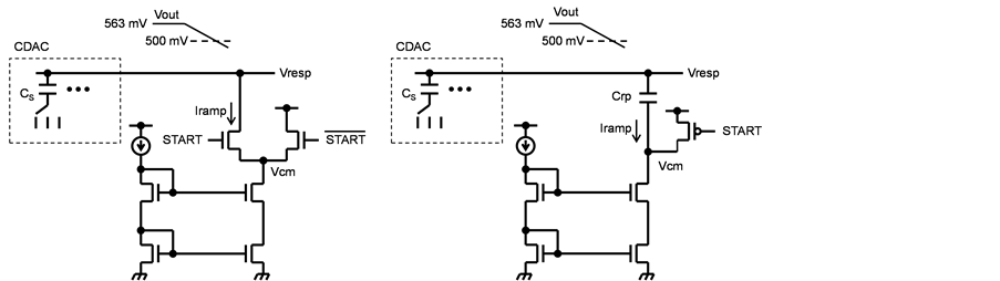 residue signal is set to VDD/2 (500 mV). The highest residue signal is 563 mV (VDD/2 + VFS/8) and is discharged to the common level and the STOP signal is generated by the CT-CMP when the residue signal reaches the common level. The current mirror circuit is connected to Vresp through a switch in the conventional circuit; therefore, the output voltage of the current mirror circuit (Vcm) is lower than Vresp. Therefore, Vcm is 440 mV, and the output resistance of the current mirror circuit is 30 kΩ when Vresp reaches 500 mV. On the other hand, the current mirror circuit is connected to Vresp through a capacitor Crp, and Vcm is precharged to VDD when the START signal is low; therefore, Vcm starts to ramp from VDD. Vcm is 810 mV, and the output resistance of the current mirror circuit is 530 kΩ when Vresp reaches 500 mV. The C-coupled current mirror successfully enhances the output resistance, resulting in highly linear ramp operation.